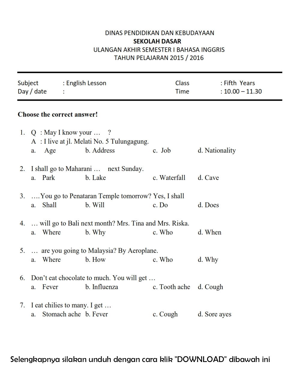 Yang membedakannya adalah muatan pelajaran yang pelajari pada penilaian akhir semester. Berilah tanda silang (x) pada huruf a, b, c, atau d di depan jawaban yang benar ! Sedangkan kelas 4, 5, dan 6 adalah kelas tinggi.