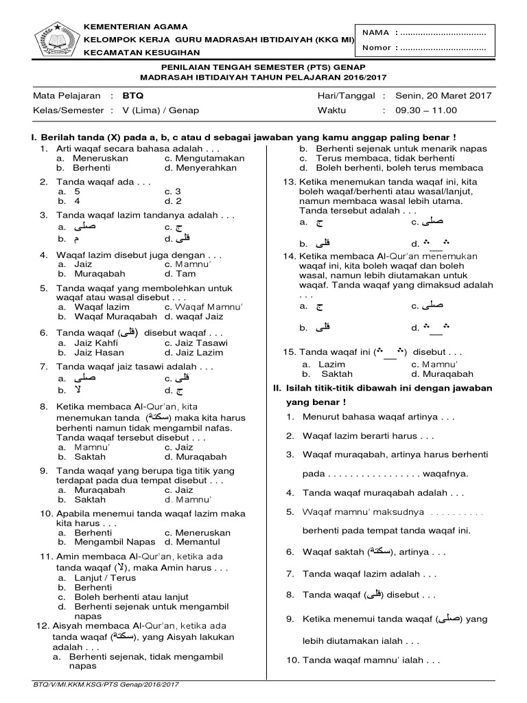 Ulangan akhir semester 1 kelas 6 k13. Download soal btq kelas 2 smt 2. We are a sharing community. Pak somad membeli 24 ekor itik jantan dan 36 itik betina. Uts btq kelas 4 5 6.