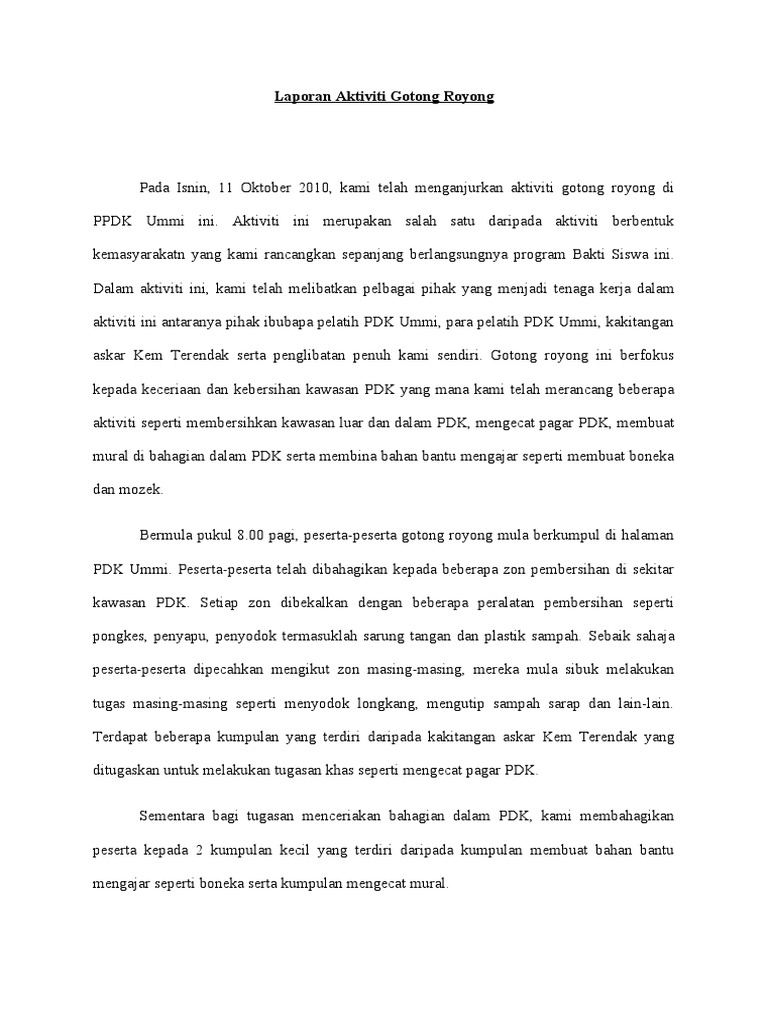 Contoh gotong royong di lingkungan masyarakat. Keperawatan jurnal keperawatan medikal bedah jurnal keperawatan jiwa jurnal keperawatan indonesia jurnal keperawatan internasional jurnal keperawatan anak contoh karangan gotong royong di kampung. Gotong royong dalam bidang pertanian, persiapan acara khitanan dan perkawinan, pembangunan fasilitas daerah, upacara adat, penanganan bencana alam, dan kematian. Selain menambah kedekatan hubungan antar sesama, gotong royong merupakan perwujudan nyata untuk mempersatukan masyarakat indonesia.